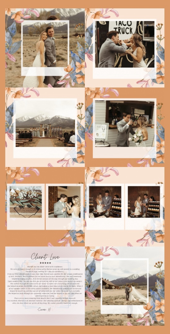 “Mariah was the BEST! 10/10 with confidence. We were fortunate enough to be contacted by Mariah when my wife posted in a wedding Facebook page, looking for a day-of coordinator. From our first conversation, it was clear that Mariah was a perfect fit. Her unique combination of skill, kindness, and excitement for her work won us over immediately! She was immensely helpful in helping us plan, from initial contact all the way through our wedding day. Upon wedding day, she was the first one to meet my wife at our venue (even before the owner). She walked through the venue with our owner to make sure everything was as-expected. She helped decorate the ENTIRE venue, and helped us tear down at the end of the night. When 3 of our wooden tables at the venue wasn’t available, she immediately jumped into action and helped us secure an entirely new set of tablecloths for the tables the venue had available. She helped us walk through our ceremony rehearsal, and she helped us cut our cake when we failed epically at trying. There are so many amazing little details that I can’t possibly include them all. In a nutshell, Mariah is an absolute rockstar. Her amazing attitude, energy, and enthusiasm for what she does lifted our spirits all day long. We cannot possibly thank her enough. We are truly grateful for the amazing service provided on our best day. Thank you so much!”